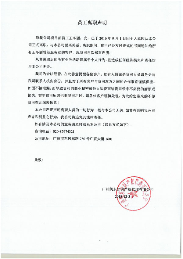 【公告】關(guān)于員工離職聲明
